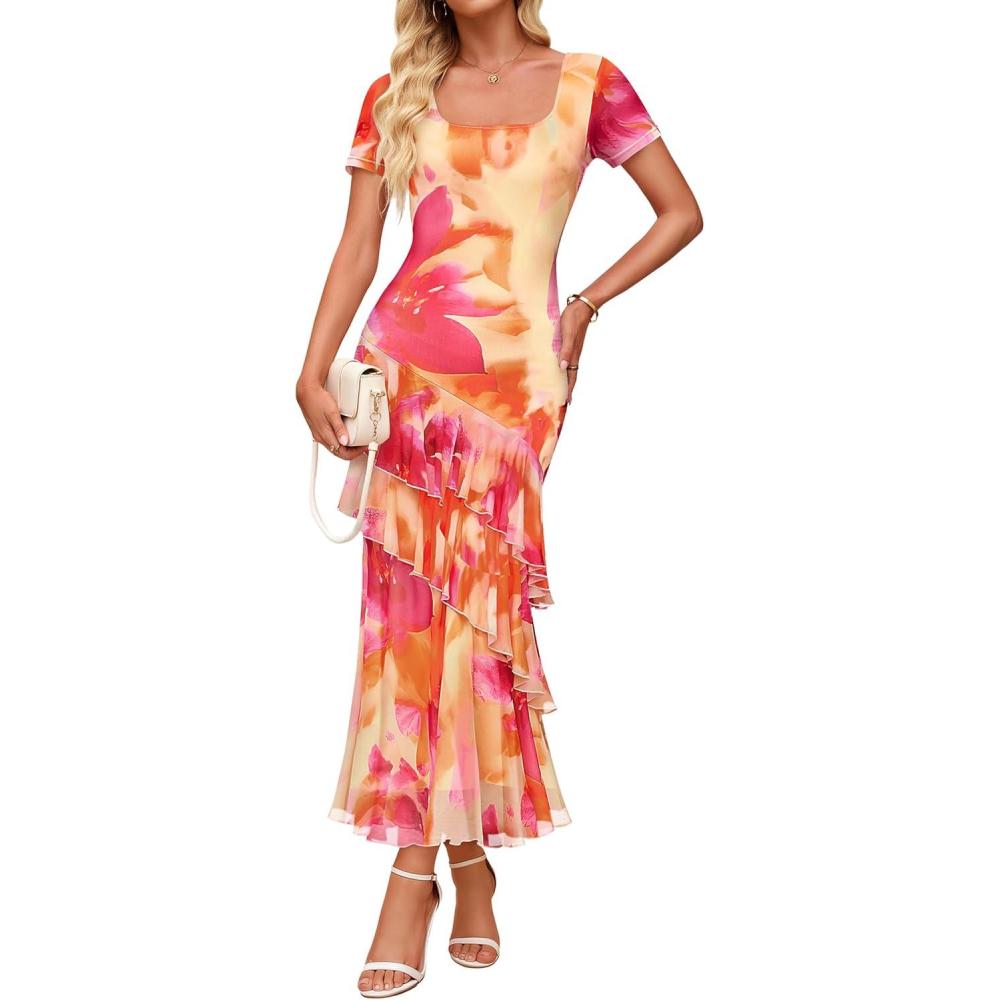 ZESICA Women’s Summer Floral Bodycon Maxi Dress 2026 Square Neck Mesh Ruffle Elegant Cocktail Wedding Party Long Dresses(Orange)