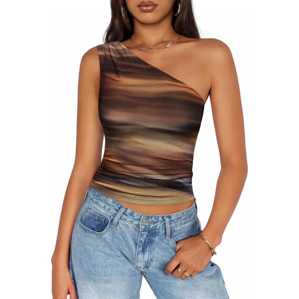 ZESICA Womens Summer Floral Going Out Tank Tops 2026 Off Shoulder Slim Fit Y2K Crop Mesh Top Beach Vacation Outfits(Brown)
