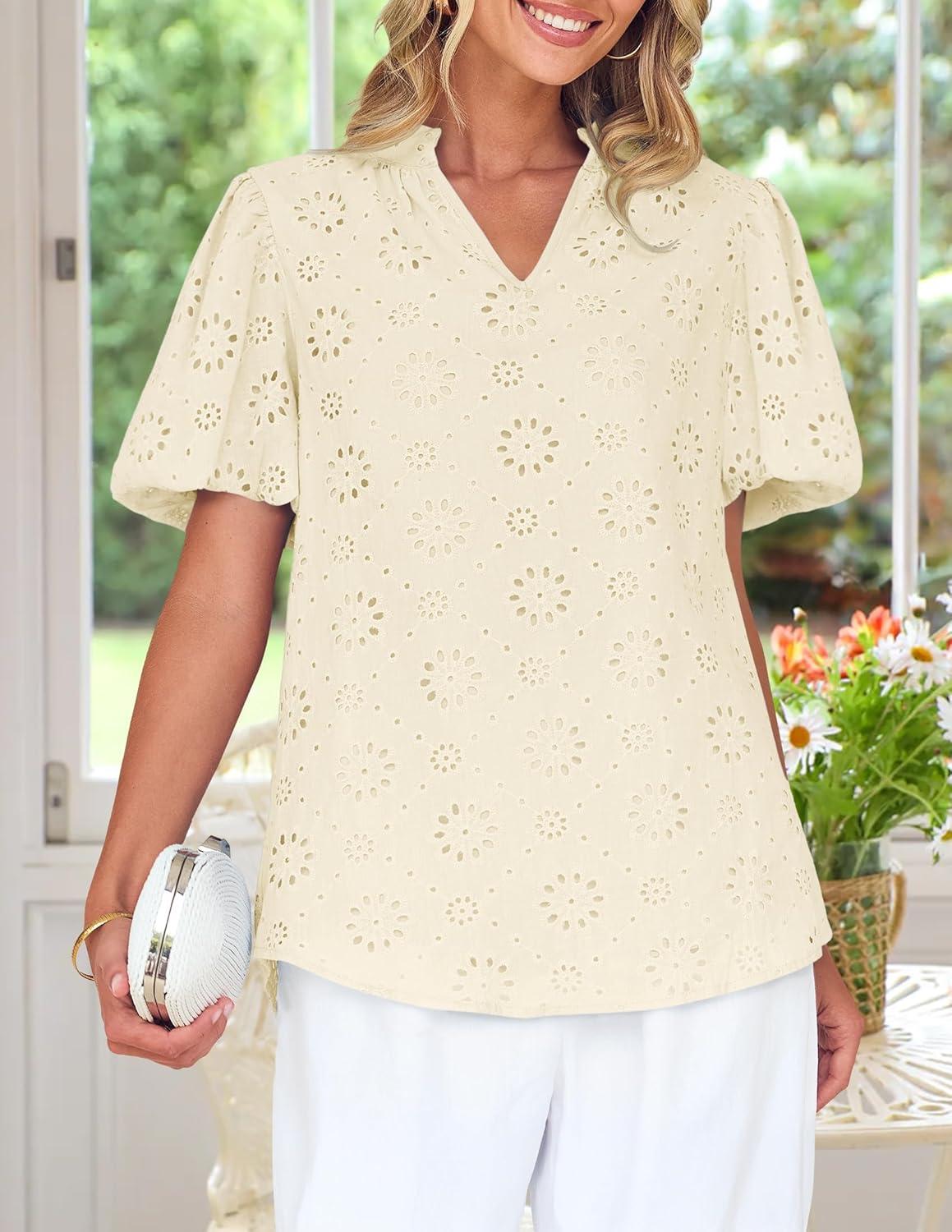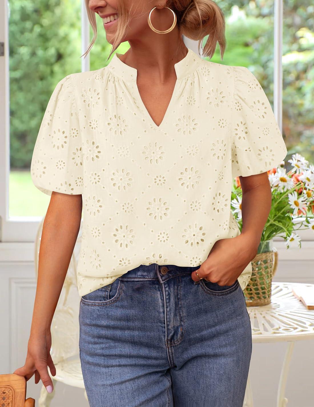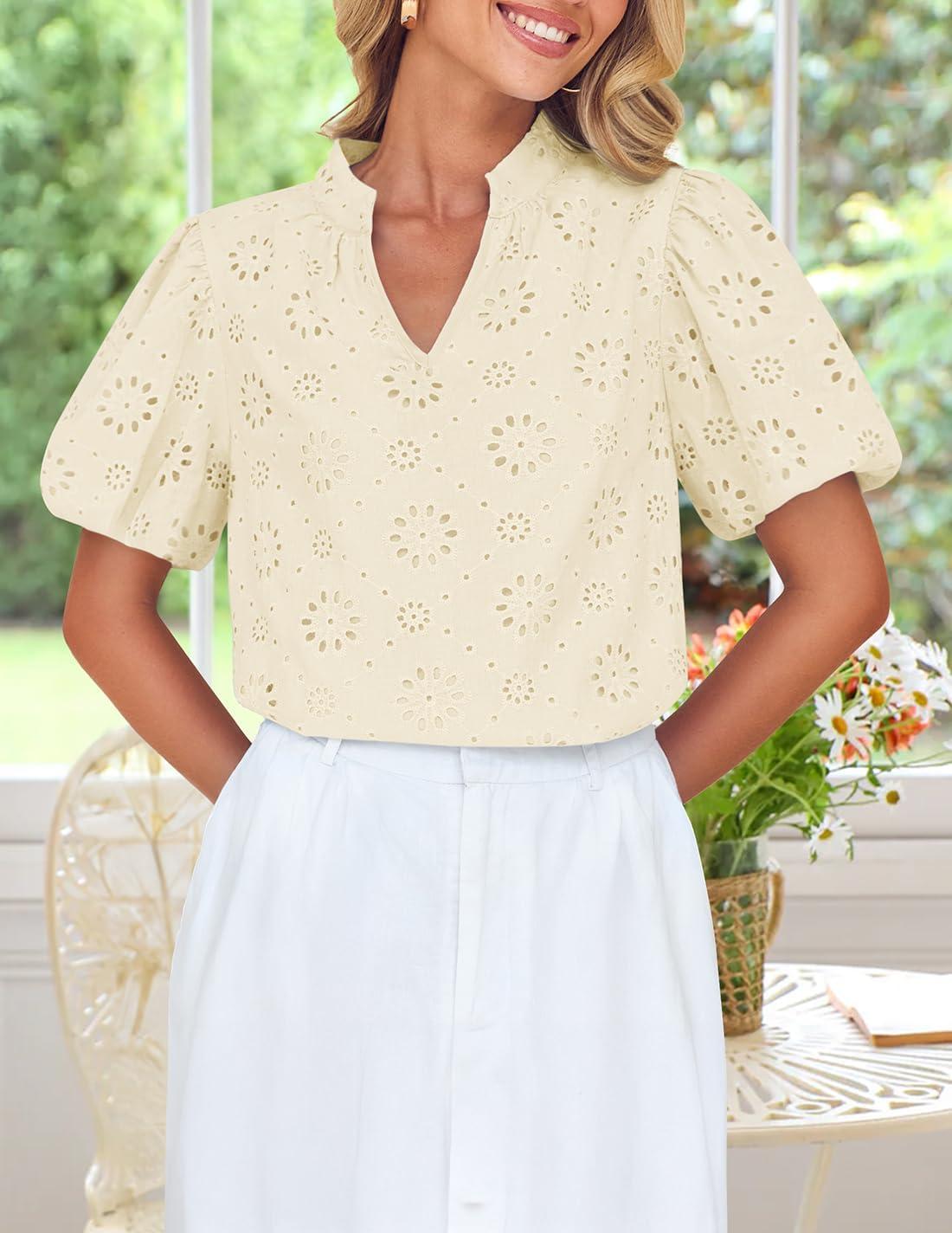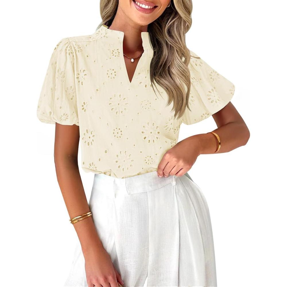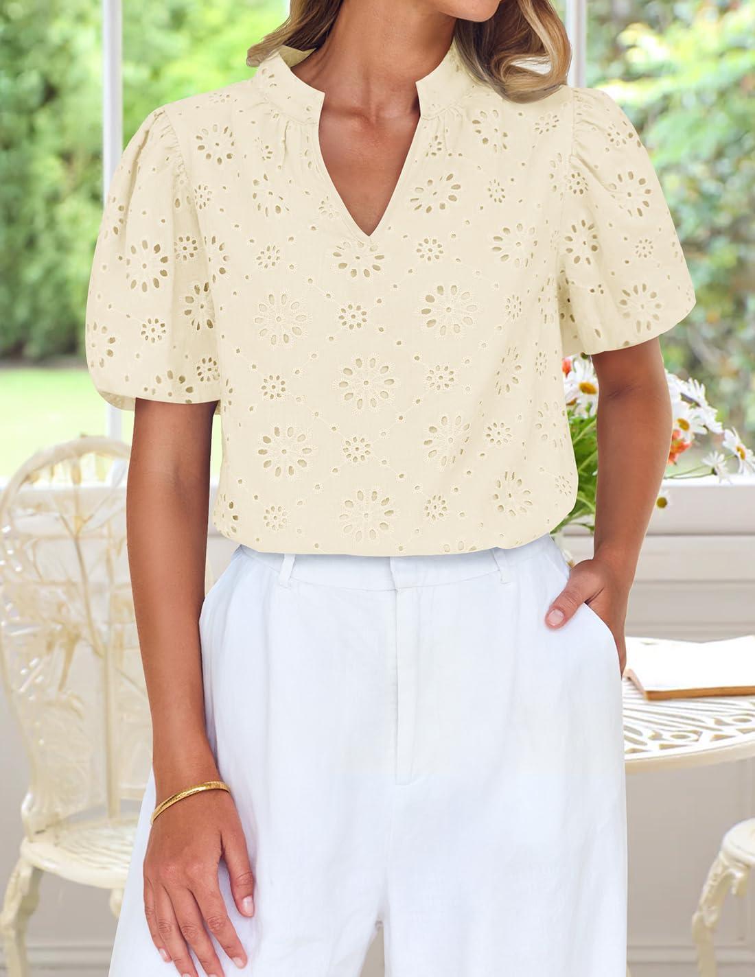 ZESICA Women’s Summer Short Puff Sleeve Shirts 2025 V Neck Casual Hollow Out Lace Embroidered Blouse Tops(Apricot)