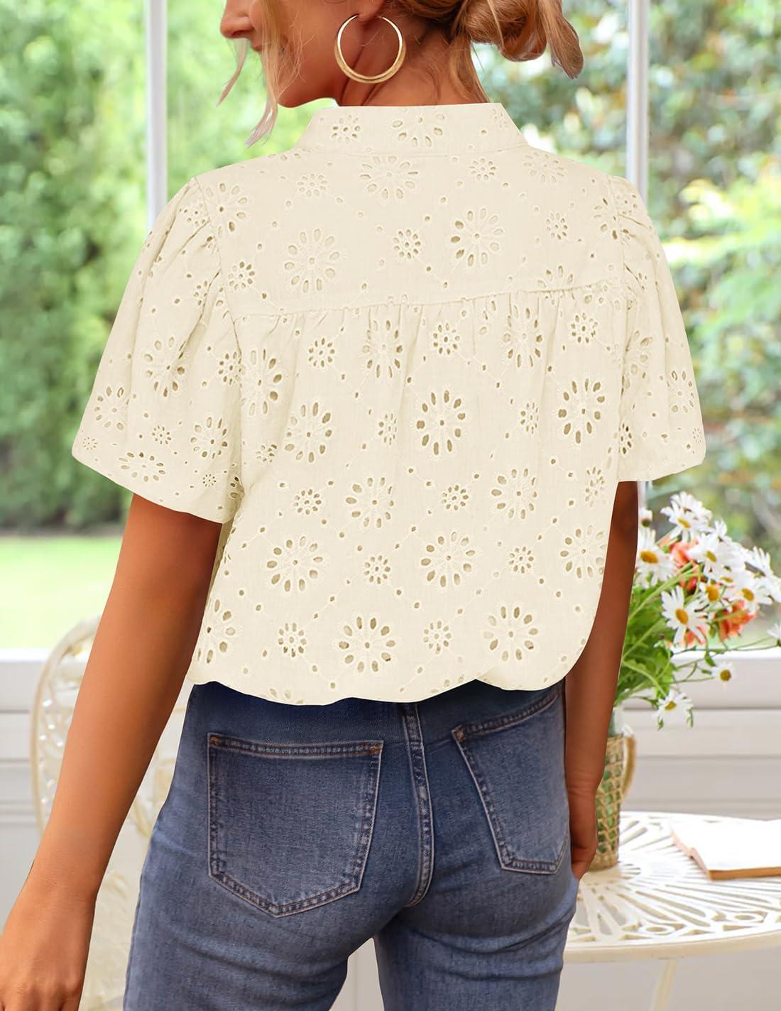 ZESICA Women's Summer Short Puff Sleeve Shirts 2025 V Neck Casual Hollow Out Lace Embroidered Blouse Tops(Apricot)