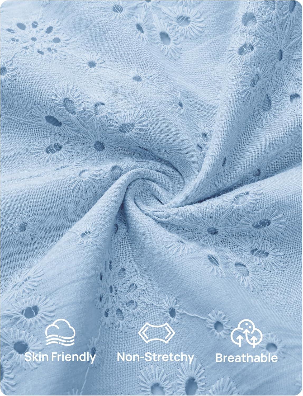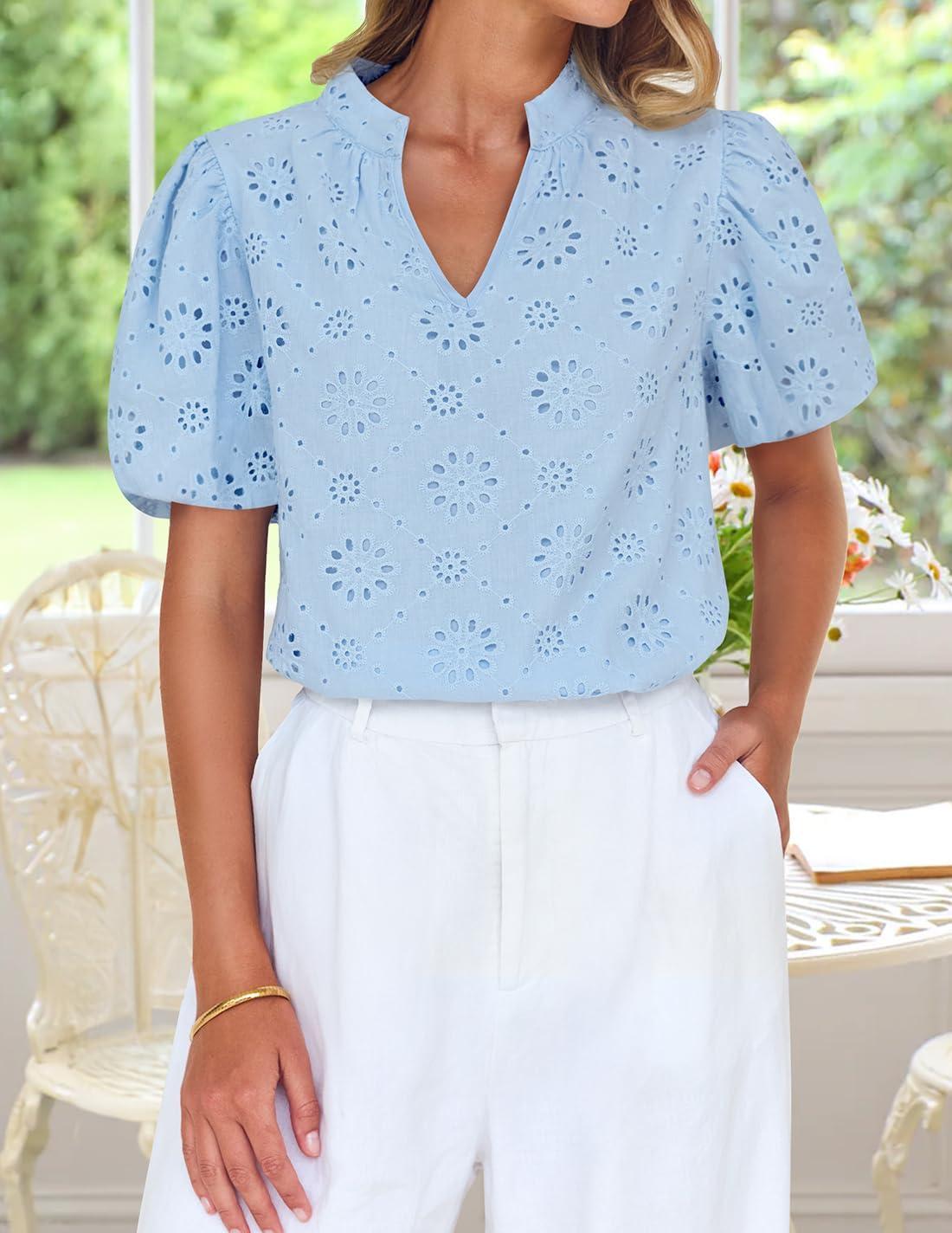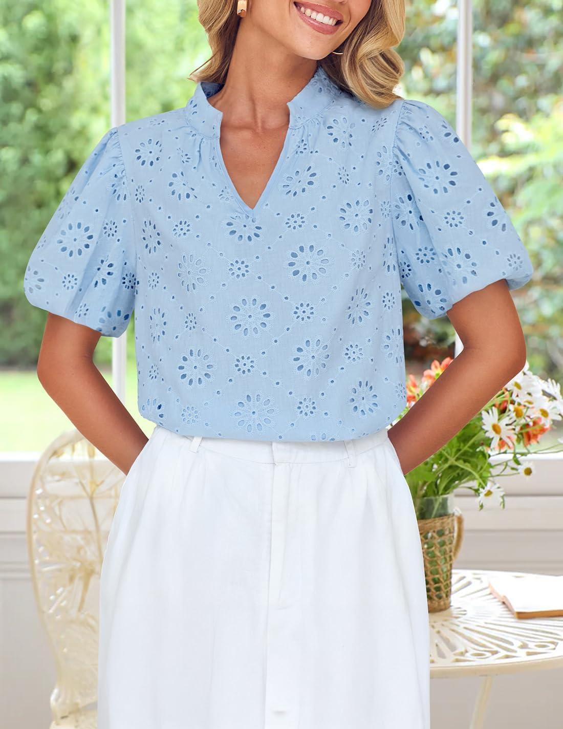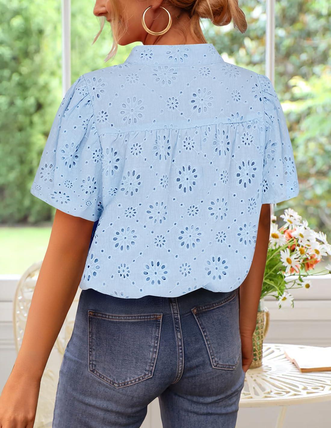 ZESICA Women's Summer Short Puff Sleeve Shirts 2025 V Neck Casual Hollow Out Lace Embroidered Blouse Tops(Blue)
