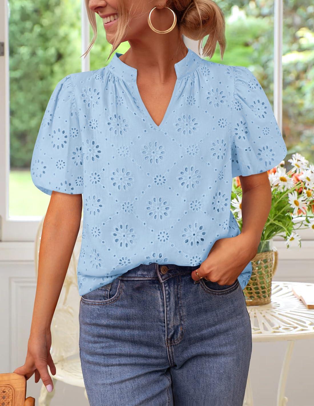 ZESICA Women’s Summer Short Puff Sleeve Shirts 2025 V Neck Casual Hollow Out Lace Embroidered Blouse Tops(Blue)
