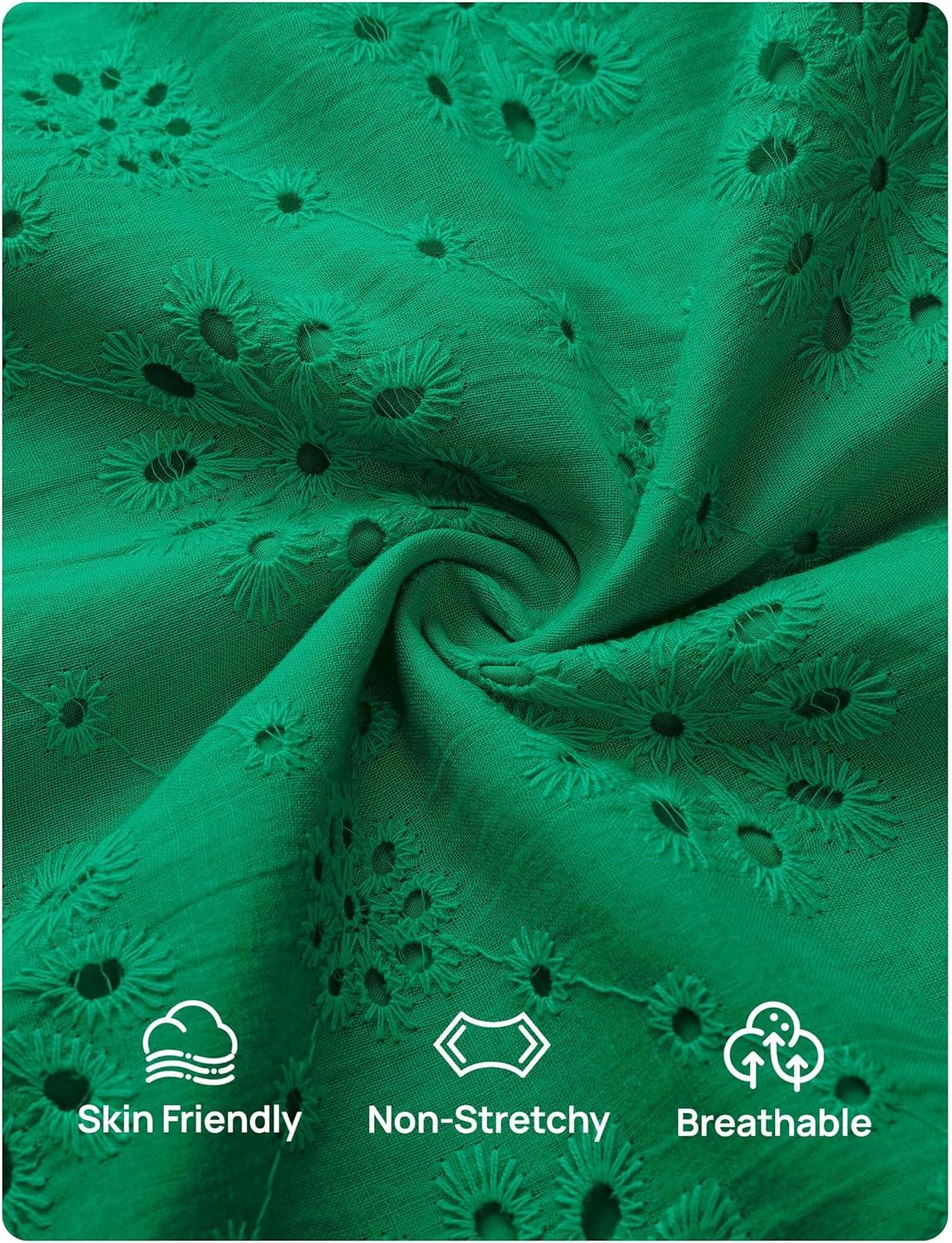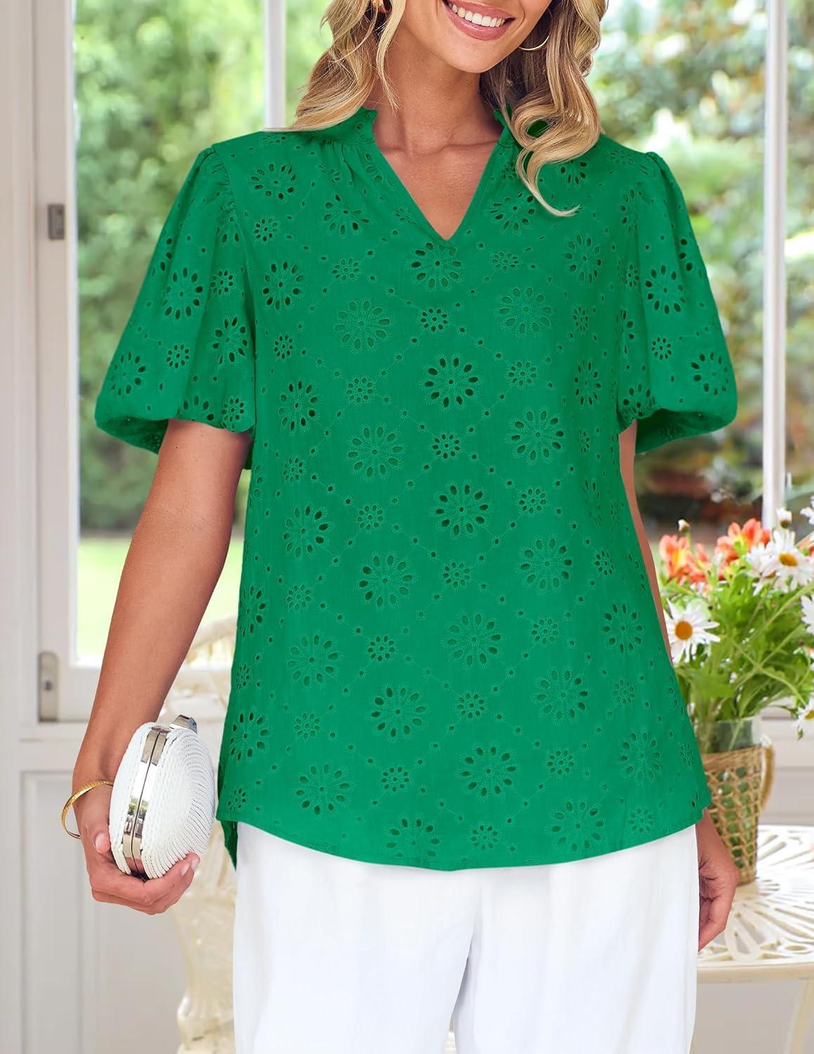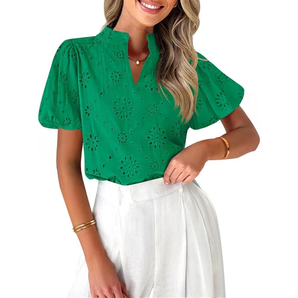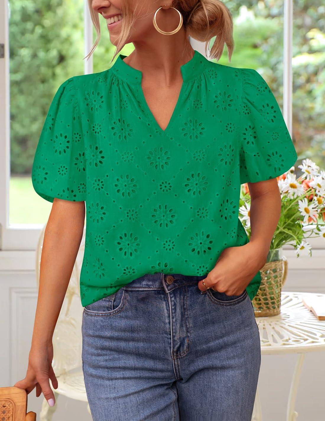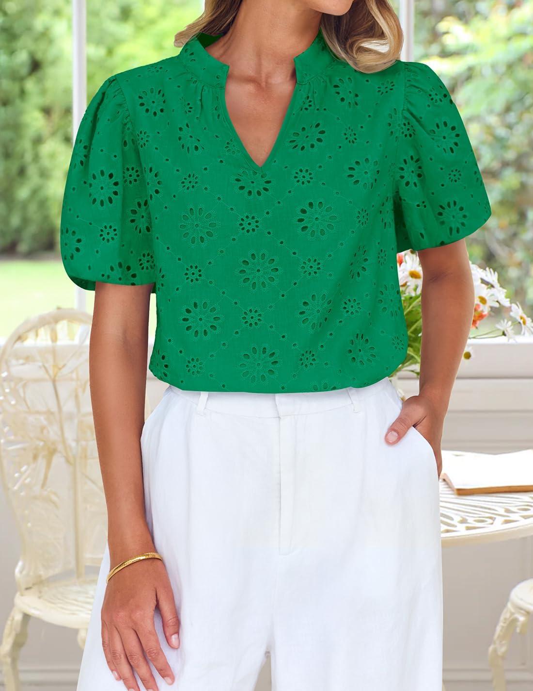 ZESICA Women’s Summer Short Puff Sleeve Shirts 2025 V Neck Casual Hollow Out Lace Embroidered Blouse Tops(Green)
