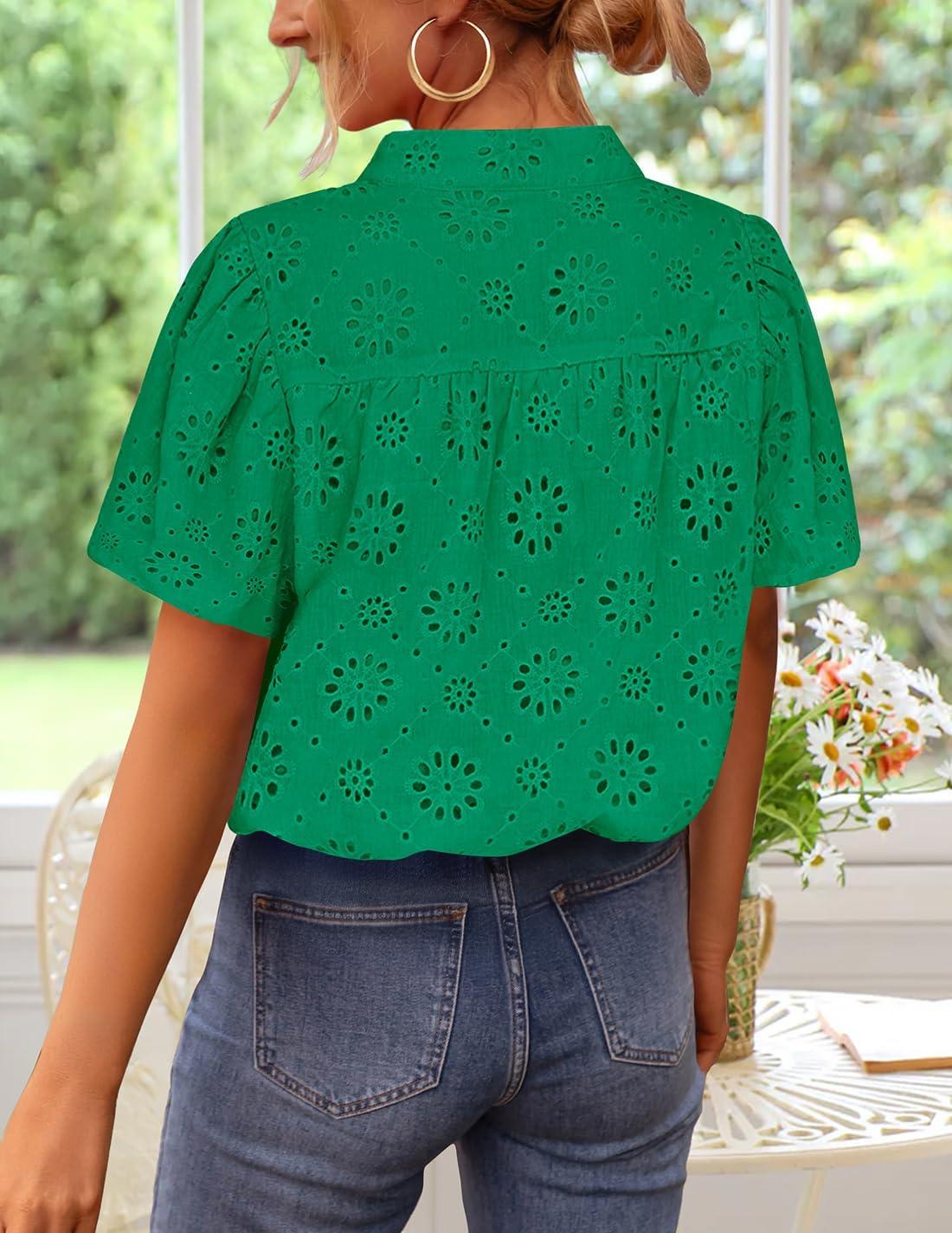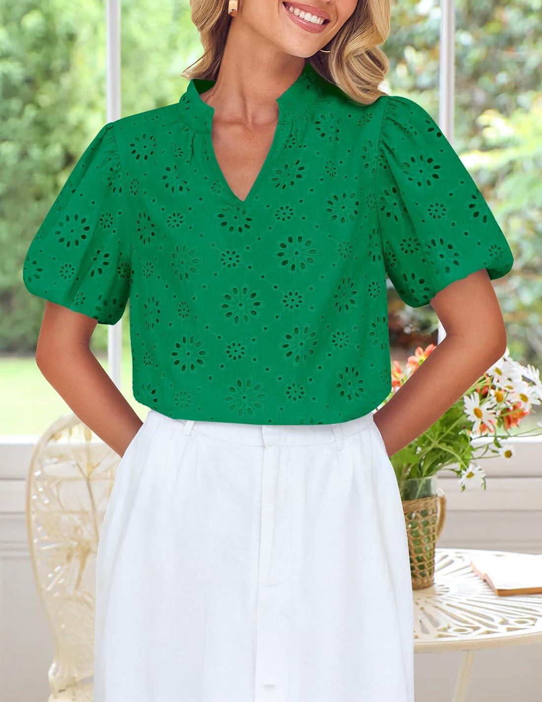 ZESICA Women's Summer Short Puff Sleeve Shirts 2025 V Neck Casual Hollow Out Lace Embroidered Blouse Tops(Green)