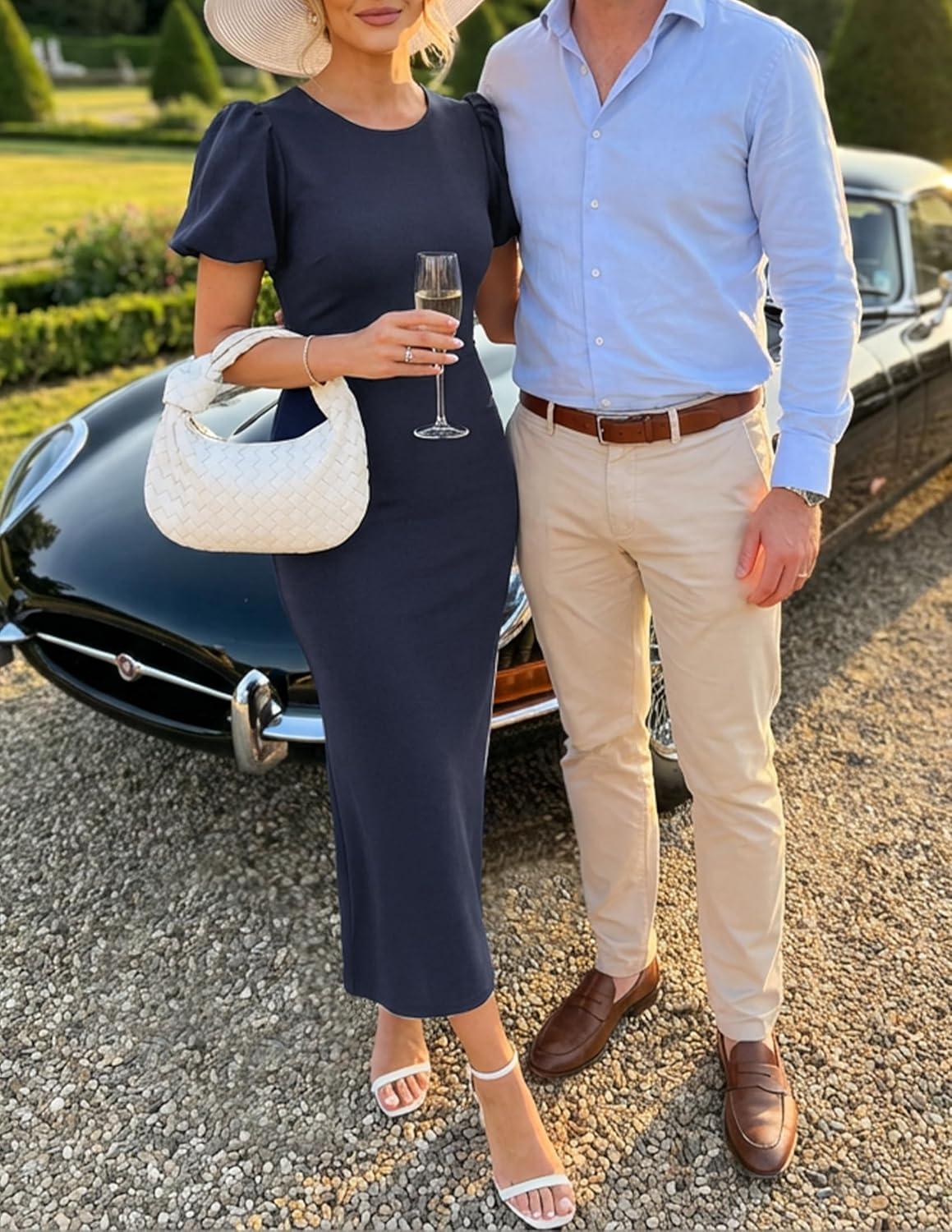 ZESICA Women’s Summer Short Sleeve Bodycon Midi Dress 2026 Spring Elegant Formal Wedding Guest Cocktail Party Dresses(Navy)