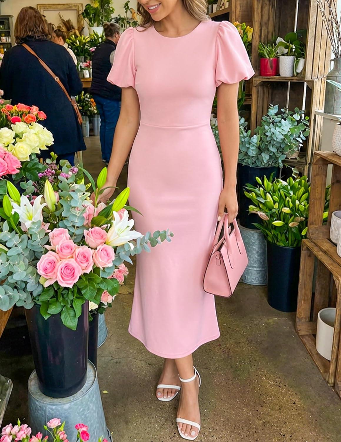 ZESICA Women’s Summer Short Sleeve Bodycon Midi Dress 2026 Spring Elegant Formal Wedding Guest Cocktail Party Dresses(Pink)