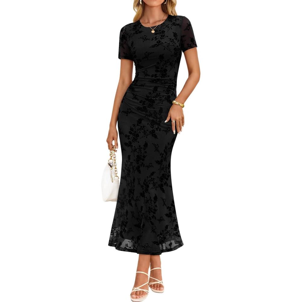 ZESICA Women’s Summer Short Sleeve Floral Bodycon Dress 2026 Ruched Mesh Wedding Guest Cocktail Party Maxi Dresses(Black)