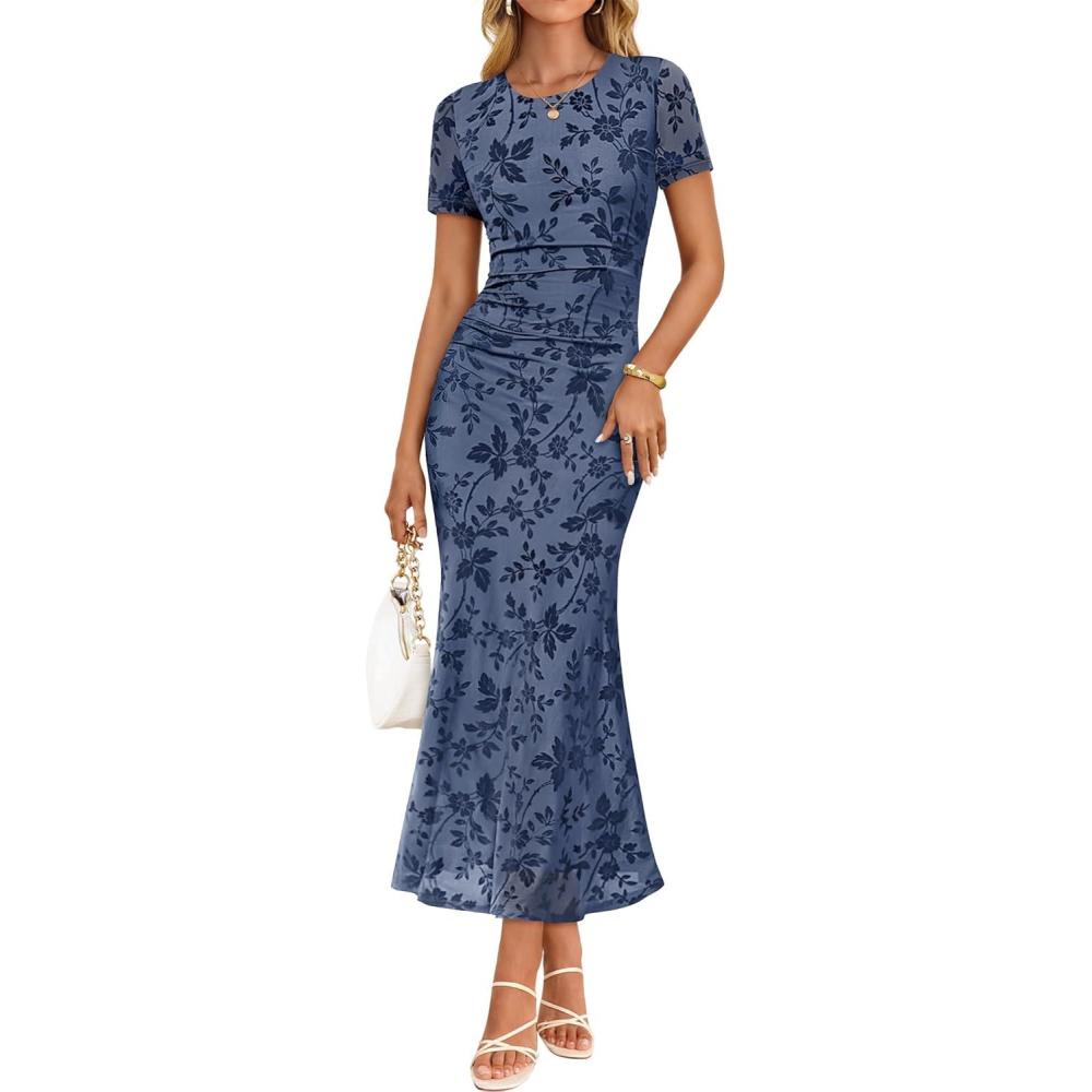 ZESICA Women’s Summer Short Sleeve Floral Bodycon Dress 2026 Ruched Mesh Wedding Guest Cocktail Party Maxi Dresses(Dustyblue)