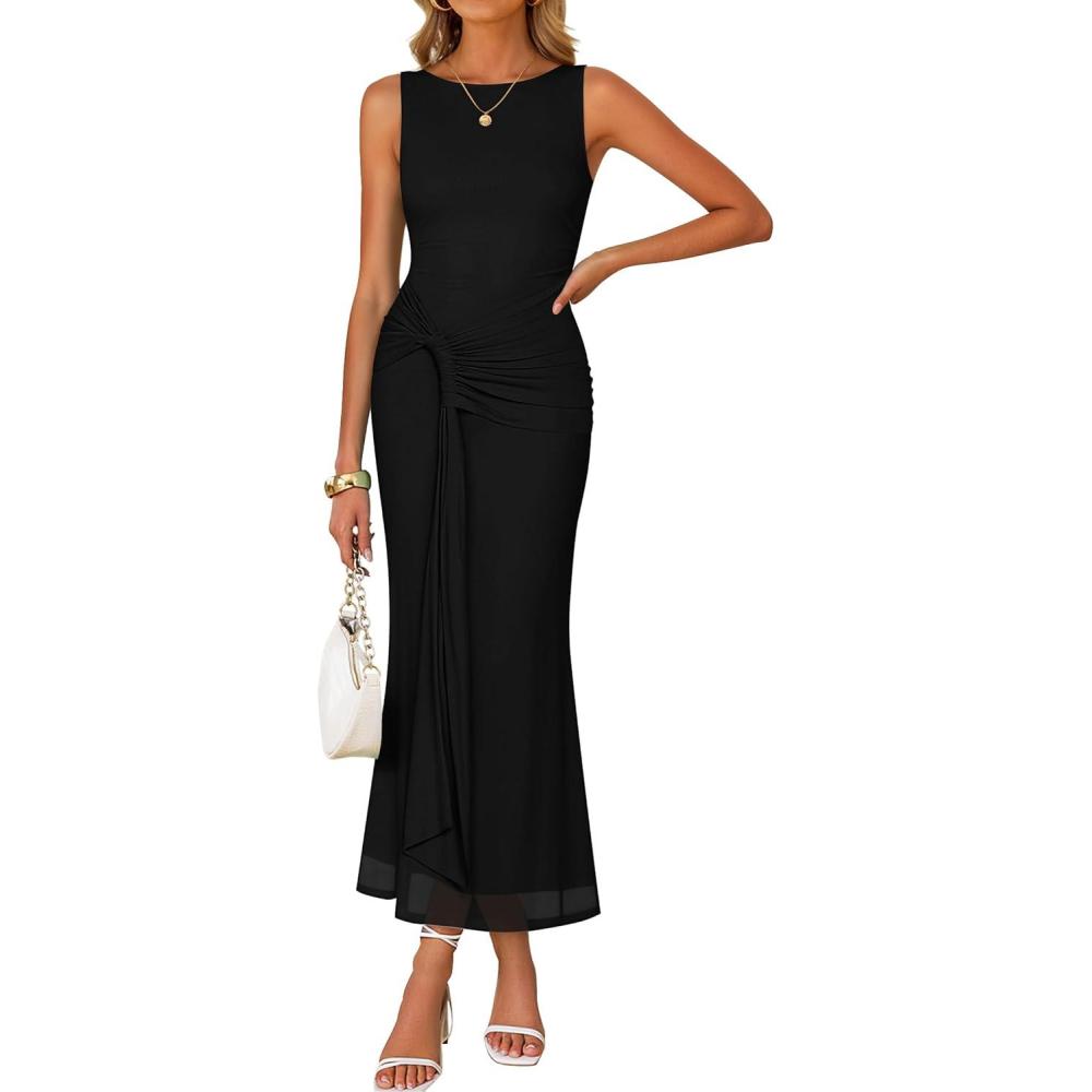 ZESICA Women’s Summer Sleeveless Bodycon Dress 2026 Crewneck Ruched Sexy Mesh Wedding Guest Cocktail Party Maxi Dresses(Black)