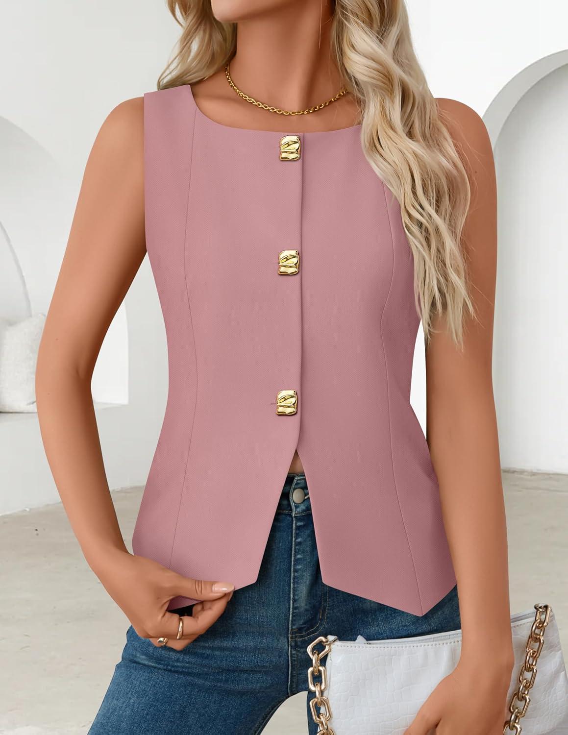 ZESICA Womens Summer Sleeveless Suit Vest 2026 Boat Neck Button Down Formal Business Casual Trendy Work Blazer Waistcoat(Pink)