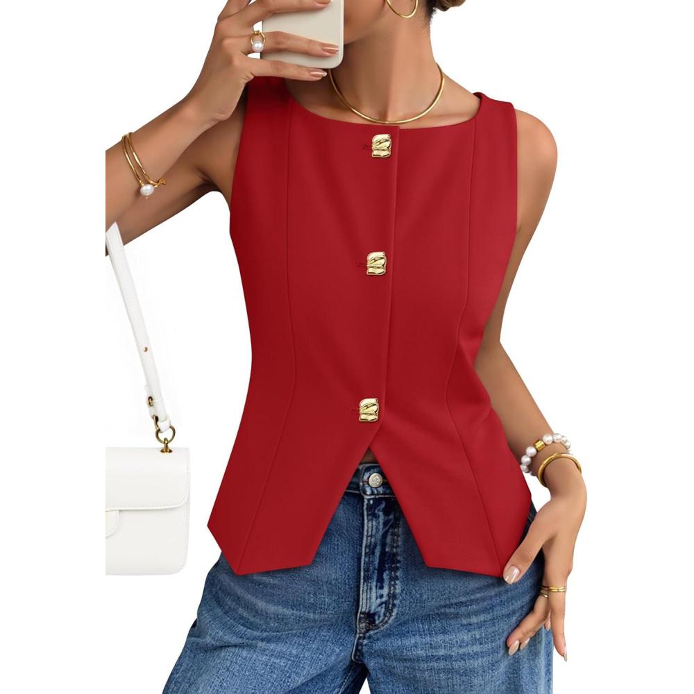 ZESICA Womens Summer Sleeveless Suit Vest 2026 Boat Neck Button Down Formal Vest Tops Casual Trendy Work Blazer Waistcoat(Red)