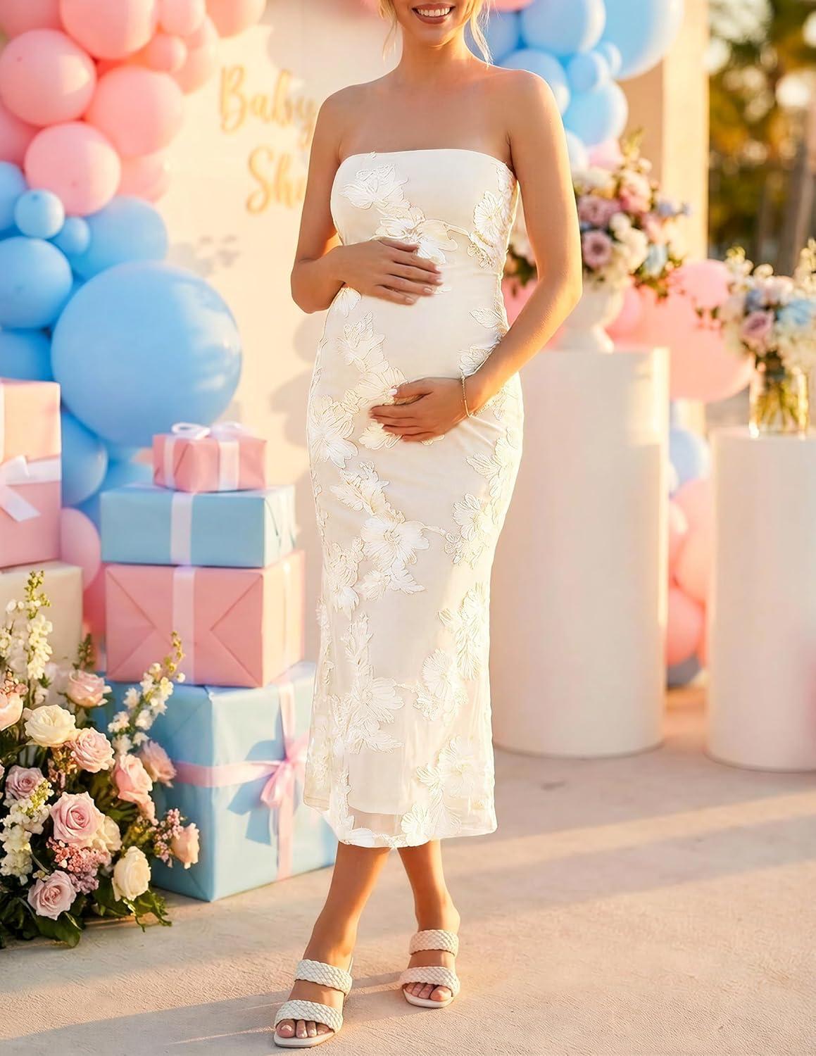 ZESICA Women’s Summer Strapless Floral Midi Dress 2026 Bodycon Mesh Tube Wedding Guest Cocktail Party Long Dresses(Apricot)