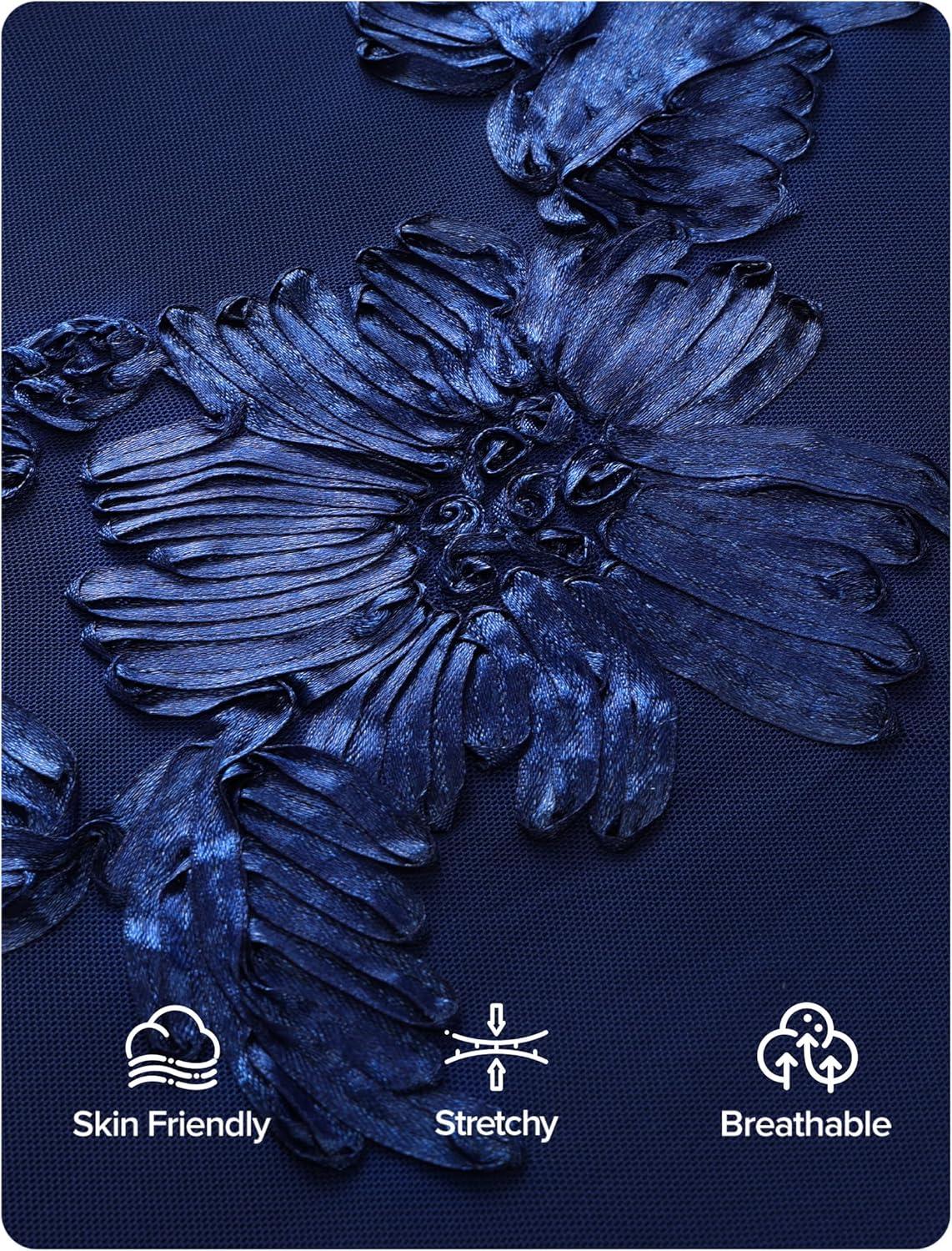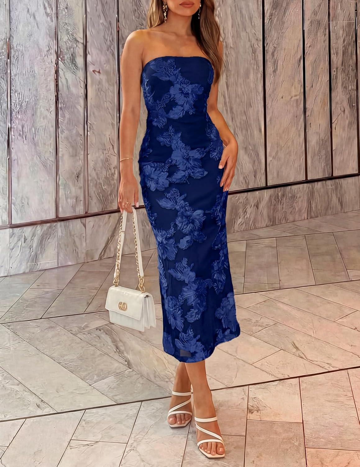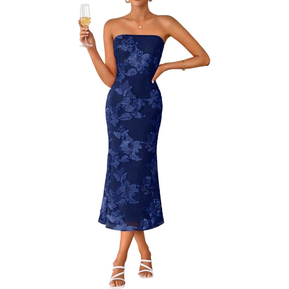 ZESICA Women’s Summer Strapless Floral Midi Dress 2026 Bodycon Mesh Tube Wedding Guest Cocktail Party Long Dresses(Navy)