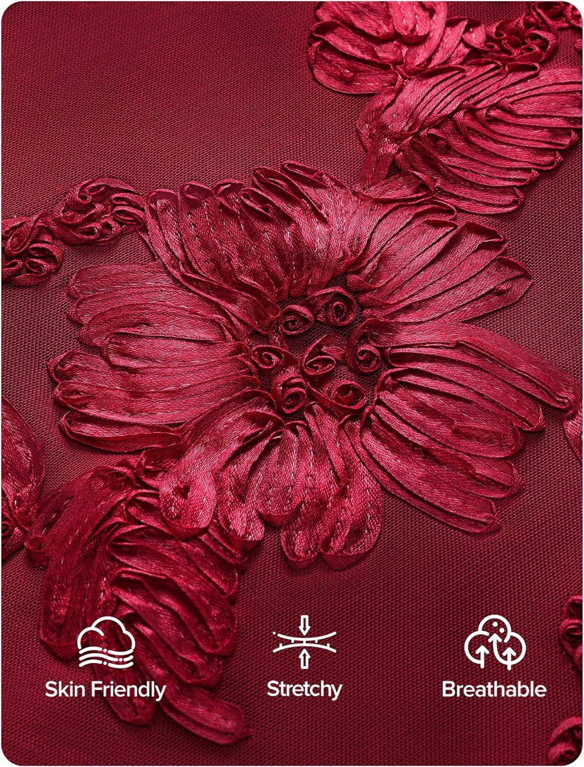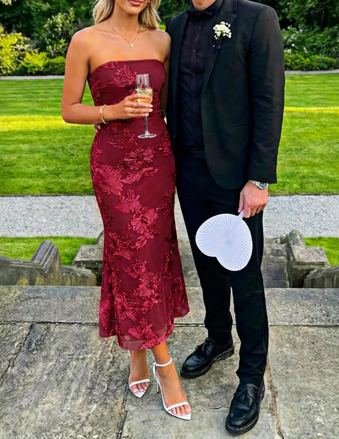 ZESICA Women’s Summer Strapless Floral Midi Dress 2026 Bodycon Mesh Tube Wedding Guest Cocktail Party Long Dresses(Red)