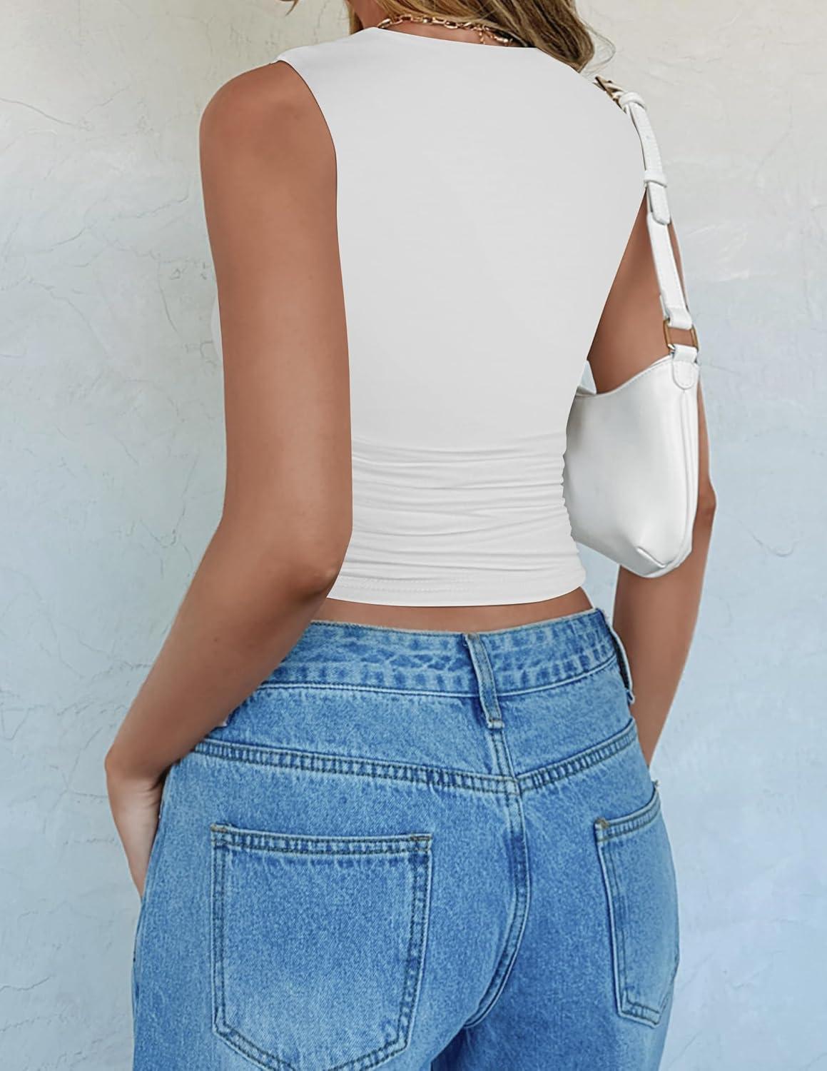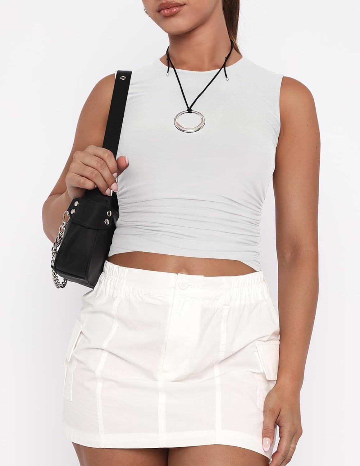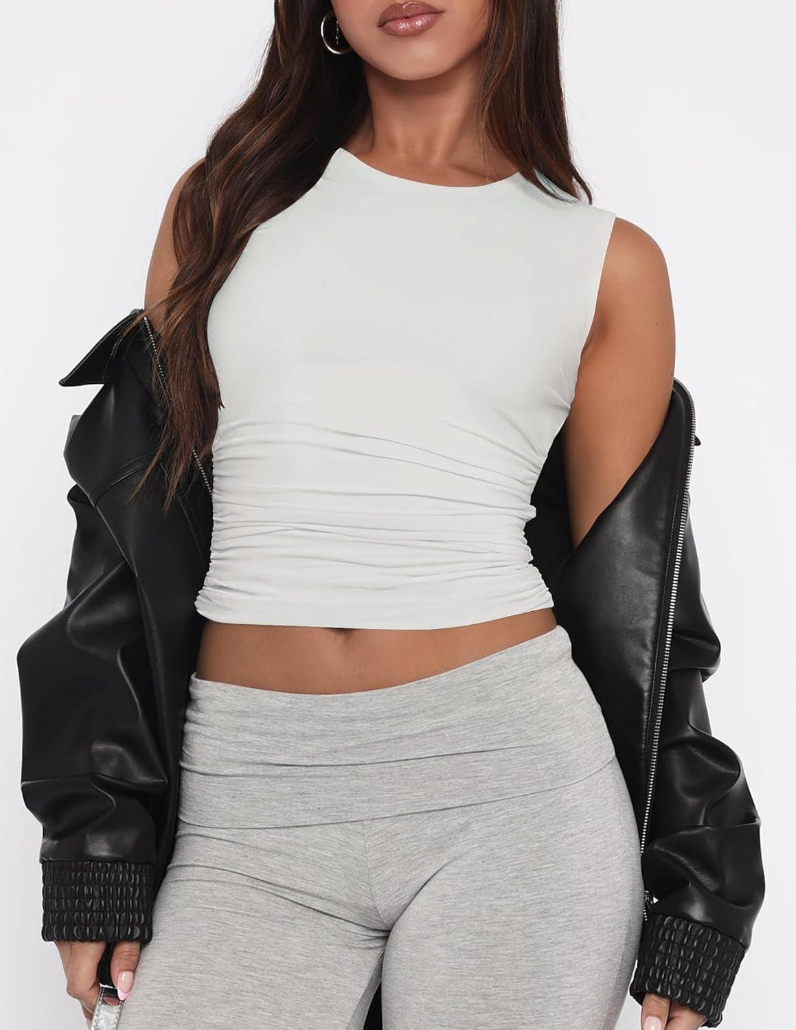 imageZESICA Womens Summer Tank Tops 2025 Sleeveless Crewneck Knit Slim Fitted Side Ruched Casual Basic ShirtIvory