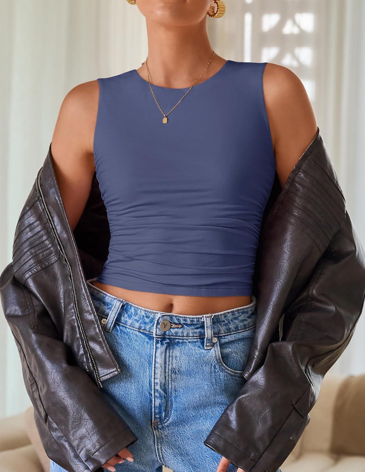 ZESICA Womens Summer Tank Tops 2025 Sleeveless Crewneck Knit Slim Fitted Side Ruched Casual Basic Shirt(Navy Blue)