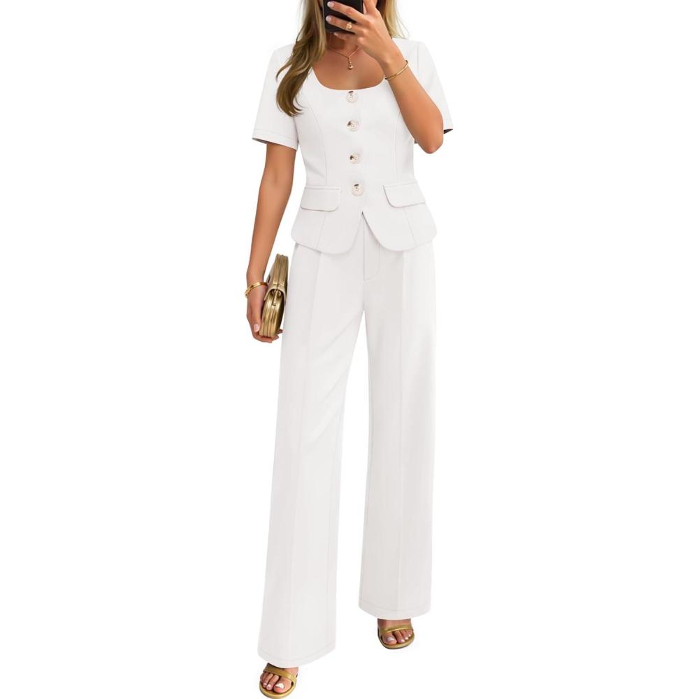 ZESICA Women’s Summer Two Pieces Suits Set 2026 Short Sleeve Blazer Wide Leg Pants Business Casual Outfits Sets(White)
