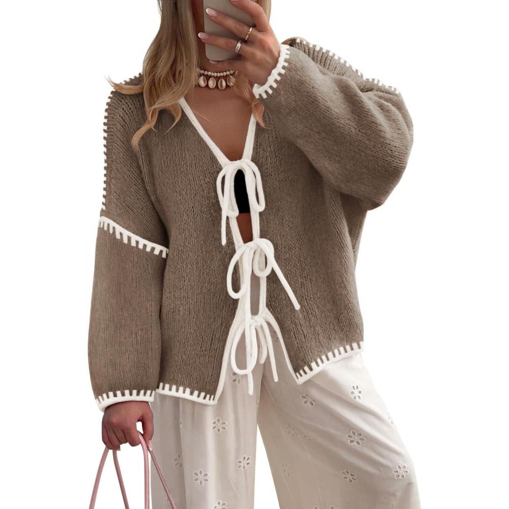 imageZESICA Womens Tie Front Bow Cardigan Sweaters 2025 Casual Long Sleeve Knit Color Block Fall Winter Clothing CoatsCamel