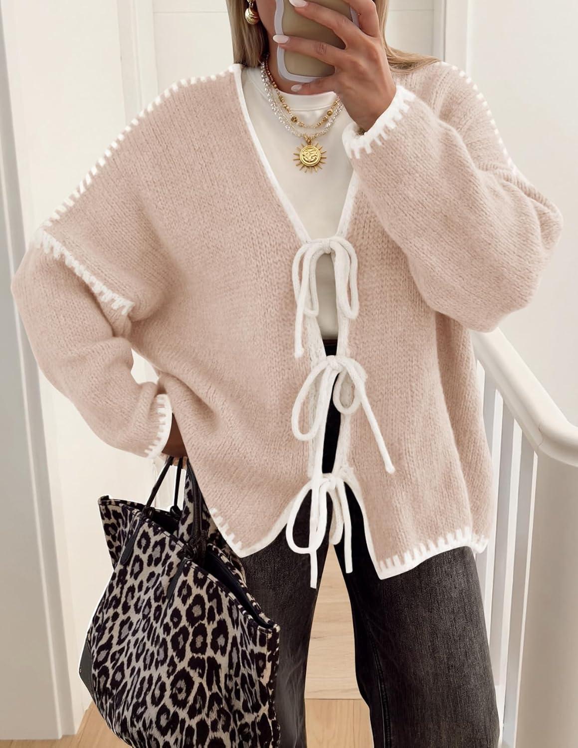 ZESICA Women’s Tie Front Bow Cardigan Sweaters 2025 Casual Long Sleeve Knit Color Block Fall Winter Clothing Coats(Oats)