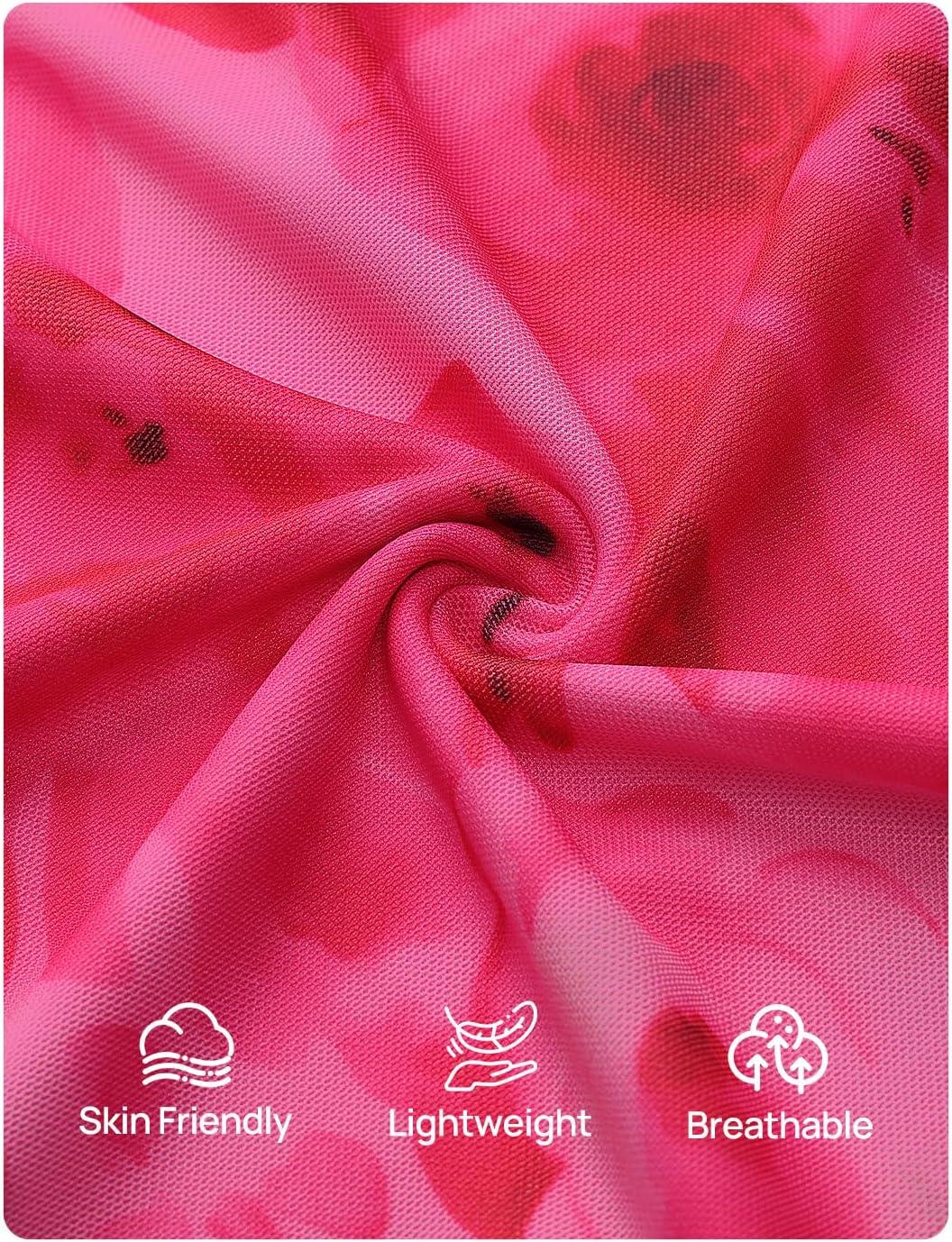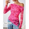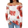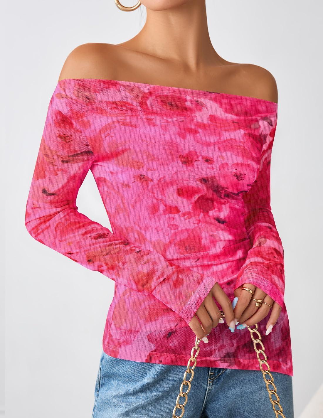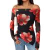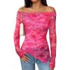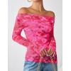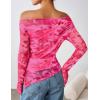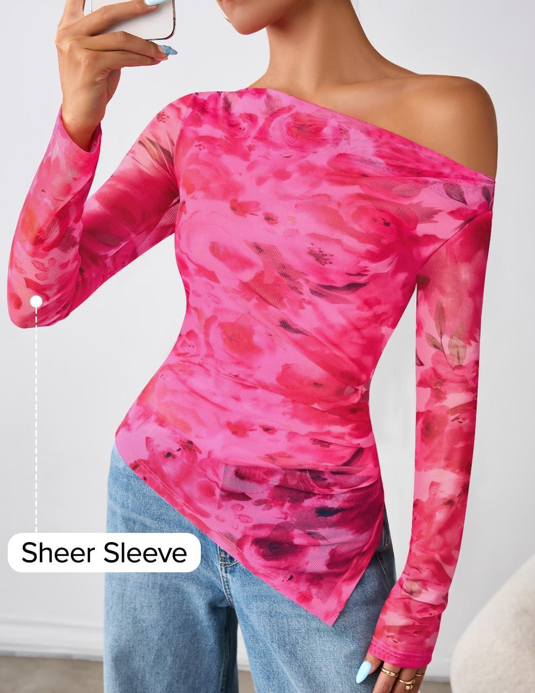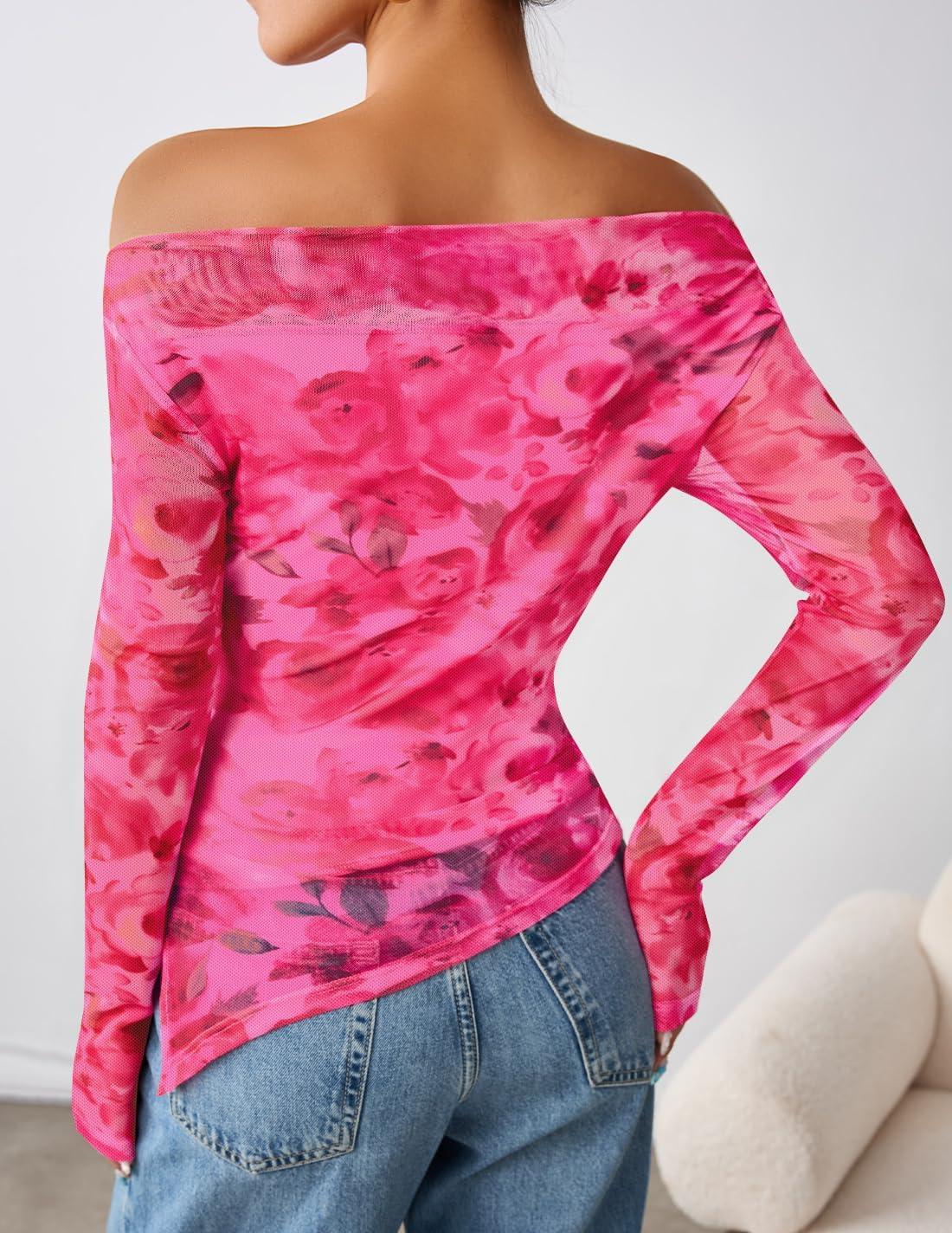 ZESICA Womens Trendy Off Shoulder Floral Mesh Tops Slim Fit Sexy Long Sleeve Shirts Asymmetrical Ruched Blouses(Pink)