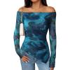ZESICA Womens Trendy Off Shoulder Floral Mesh Tops Slim Fit Sexy Long Sleeve Shirts Asymmetrical Ruched Blouses(Lakegreen)