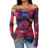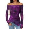 imageZESICA Womens Trendy Off Shoulder Floral Mesh Tops Slim Fit Sexy Long Sleeve Shirts Asymmetrical Ruched BlousesPurple