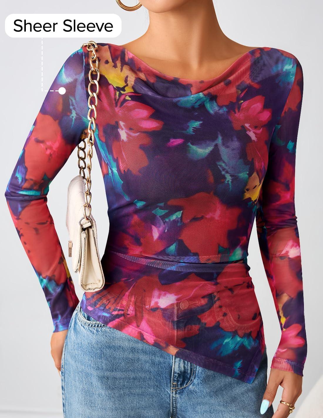 imageZESICA Womens Trendy Off Shoulder Floral Mesh Tops Slim Fit Sexy Long Sleeve Shirts Asymmetrical Ruched BlousesPurplered