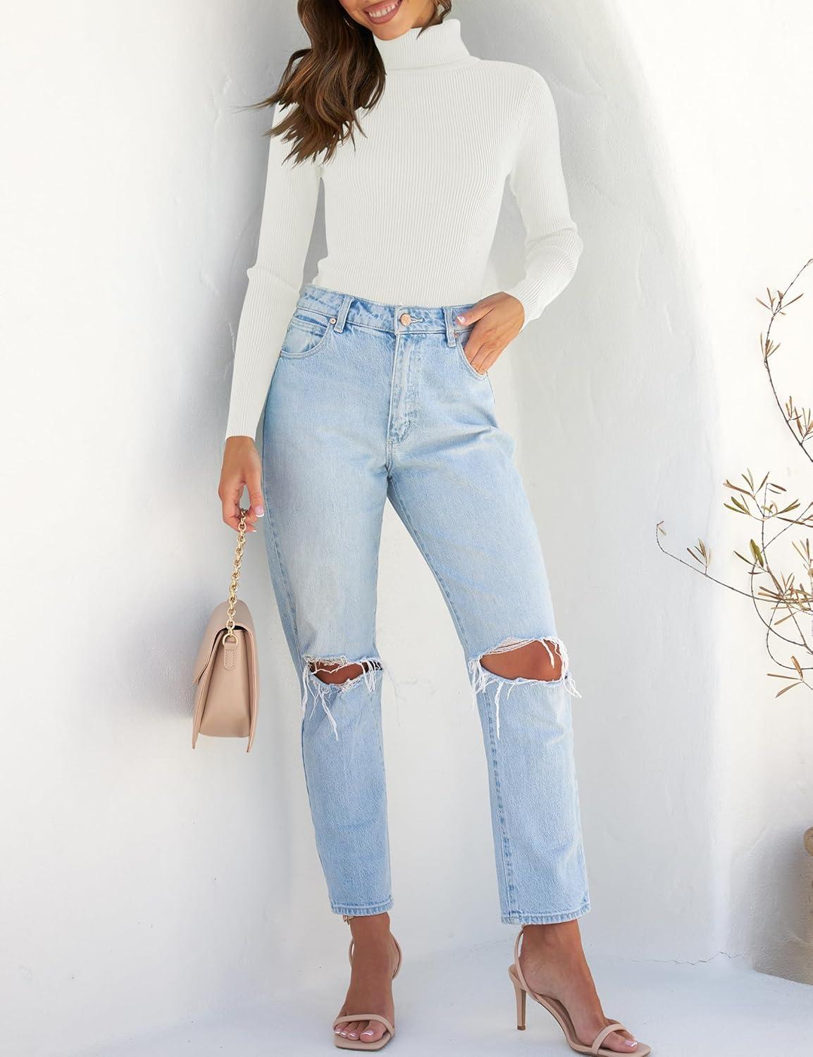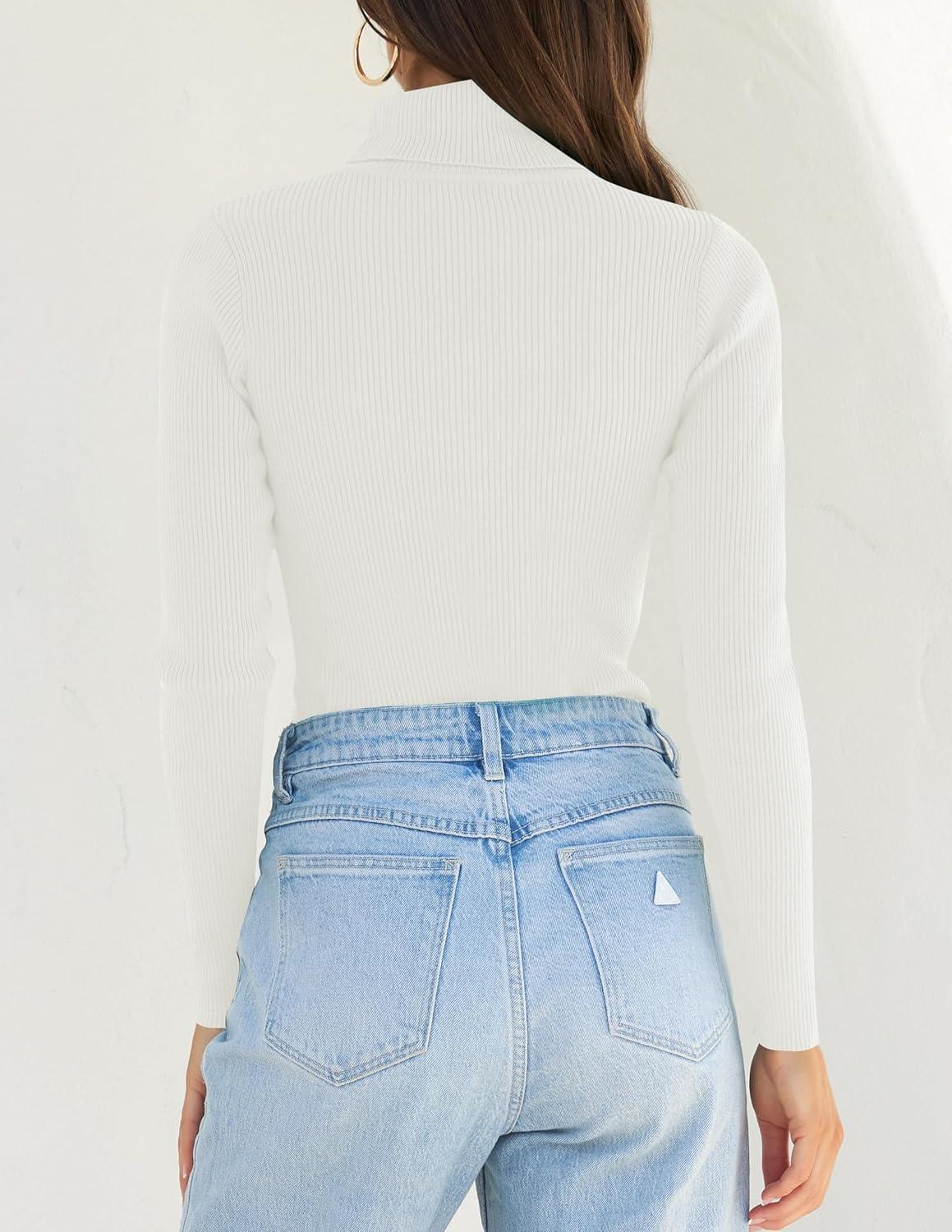 imageZESICA Womens Turtleneck Long Sleeve Shirts 2025 Fall Trendy Tops Slim Fitted Ribbed Knit Basic Casual SweaterWhite
