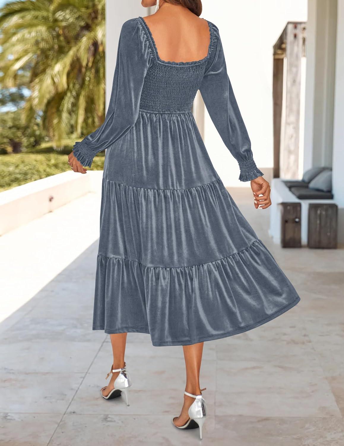 Save big on ZESICA Women’s Velvet Long Sleeve Dresses 2025 Fall Square Neck Smocked Ruffle A Line Flowy Midi Dress with Pockets(Dusty Blue) during our summer blowout sale. Limited quantities available.