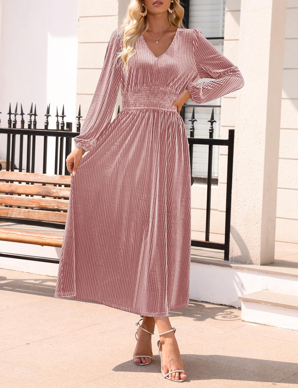 ZESICA Women’s Velvet Midi Dress 2025 Casual V Neck Long Sleeve Solid Color Elastic High Waist Flowy Evening Party Dresses(Dusty Pink)