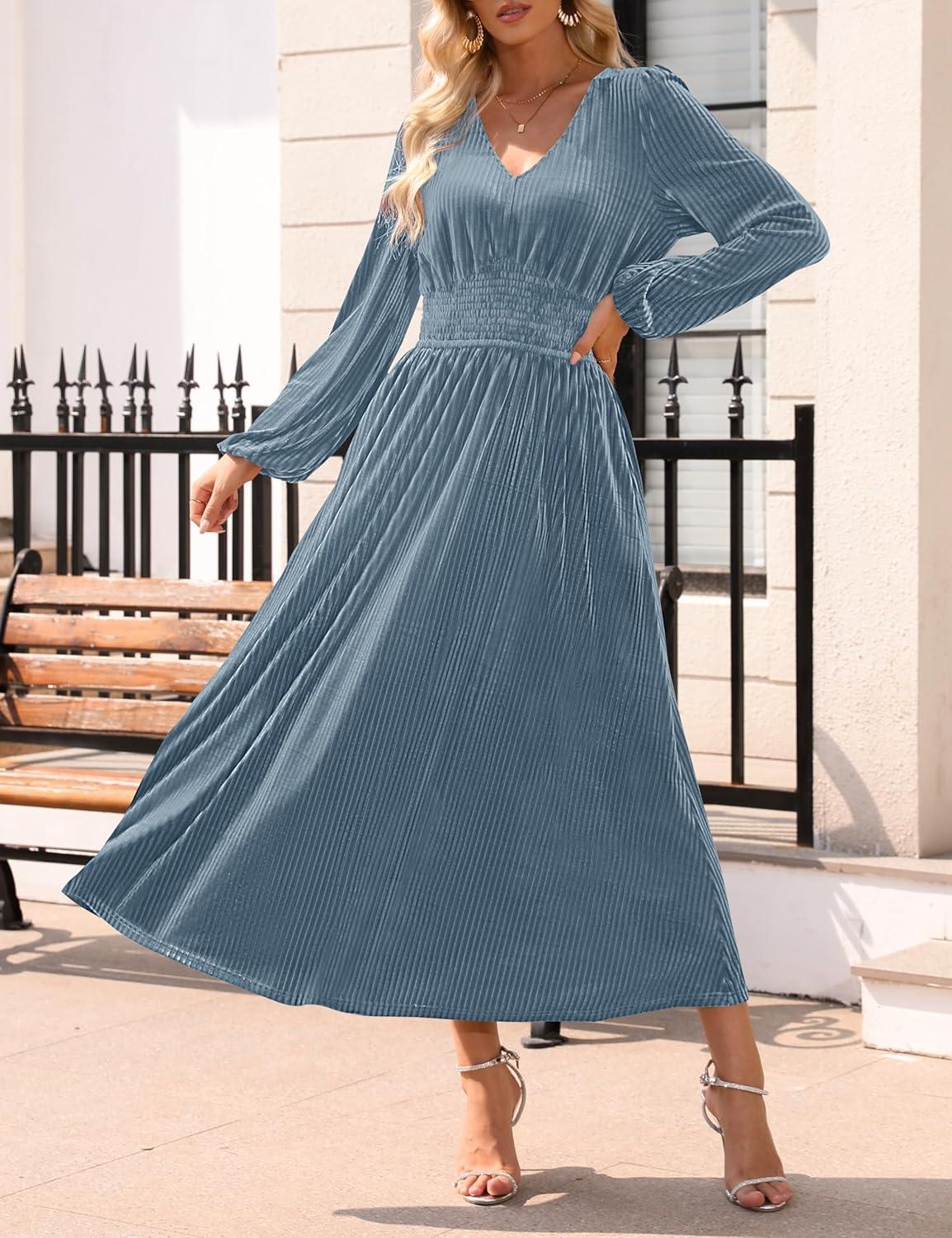 ZESICA Women’s Velvet Midi Dress 2025 Casual V Neck Long Sleeve Solid Color Elastic High Waist Flowy Evening Party Dresses(Grey Blue)